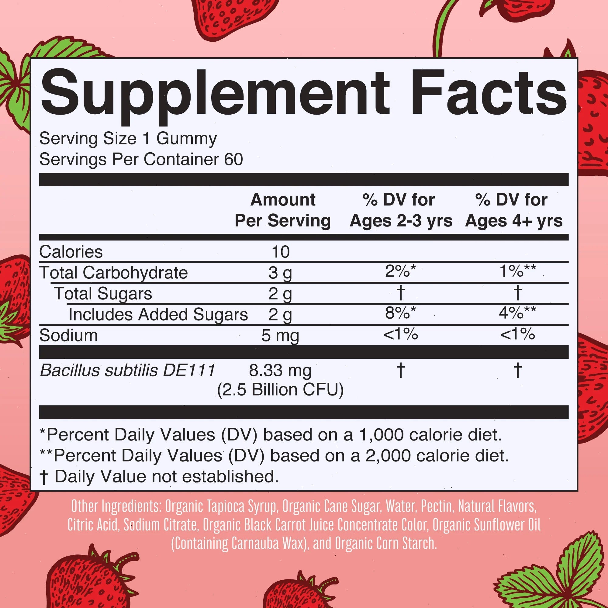 Immune Function: Bacillus subtilis may also contribute to normal immune function, providing support you can feel good about giving your little one. Made with Pectin, not Gelatin: A plant-based gummy your family can feel good about — soft, chewy, and a delicious strawberry flavor for kids to enjoy.
